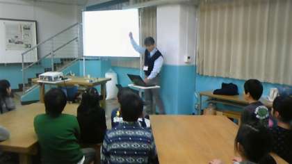 ものづくり工房では、京都のものづくりの会社について展示パネルなどを見たり話しを聞いたりします。