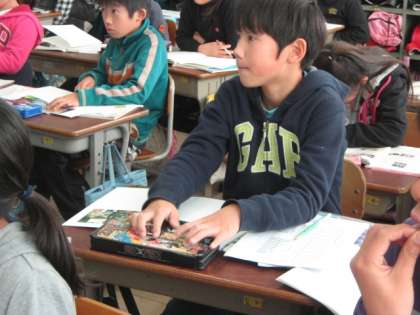 4年生も国語の学習「「仕事リーフレット」を作ろう」という教材で,自分が取材した仕事について,写真と文章を対応させたリーフレットを作る準備をしていました。撮影してきた写真の配置や,取材メモを基に,先生の説明を聞きながら紙面の割り振りを熱心に考えていました。写真と説明文の効果的な配置を考えて独創的なリーフレットができるといいですね。