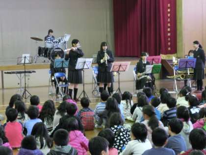 本校全児童が体育館に集まり,前半は東稜高校吹奏楽部の演奏を聴きました。「ひこうき雲」など親しみのある3曲を演奏していただき,子どもたちは生演奏に感動し,聴き入っていました。