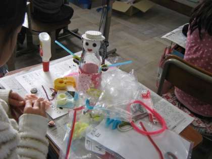 空き瓶を活用して,オリジナルの人形を作っています。紙粘土に色をつけて顔や手足を作って貼り付けています。豊かな表情がそれぞれ個性的でとても素敵です。