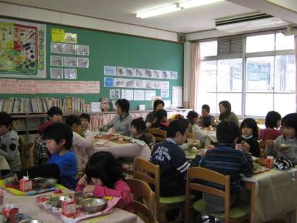 給食時間に,2・3月生まれの1〜6年生の子どもたちと,教職員がランチルームに集まり,お誕生日の歌を歌った後,牛乳で乾杯して会食しました。