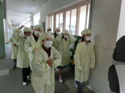 PTAにご購入いただき,給食当番は今年から5年生はブルー,6年生はクリーム色の明るい色のエプロンと帽子を身につけています。