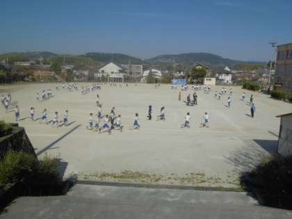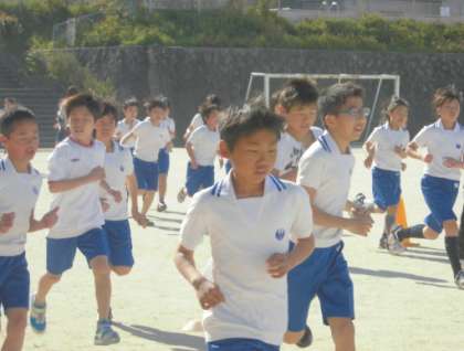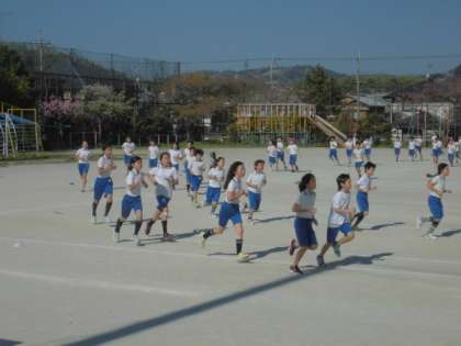 子どもたちは,登校後,毎朝,運動場に出てウォームアップをした後,自分のペースで5分間のランニングを続けます。