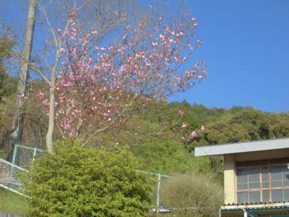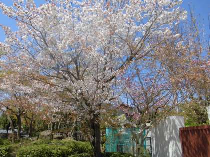 校門の遅咲きのソメイヨシノが青空に映えています。