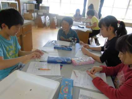 理科室では,5年生が専科担当の教員と理科の学習を進めていました。