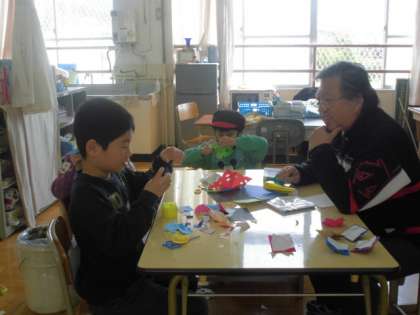 あすなろ学級では,クラス目標を書いた掲示物の飾りを色紙で作っていました。お花の形に折ったり,はさみを使って切り紙したり,華やかな飾りが次々に出来上がっていきます。