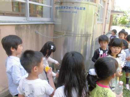 1年生は,給食の牛乳パックを植木鉢に活用して,ヒマワリの種まきをしました。やさしく種をまいた後,水やりのするために,雨水タンクの水をペットボトルに入れていました。お行儀よく順番が待てていますね。