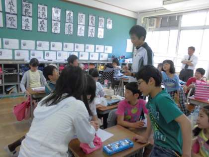 5年生の教室では,2年生の担任が図工の指導を進めていました。一人一人,自分の家から持ってきた布を見つめて,その素材の風合いや,色や形から,どんなものが創れるか想像を広げていました。今週からきている教育実習生が,子どもたちのそばで,想像を広げる助言を与えてくれていました。