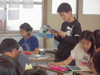5年1組の教室では,教育実習生が算数の模擬授業を進めていました。少数のかけ算の学習で,少数をかけるとどうして答えが元の数より小さくなるのかということをみんなで考えていました。実習生の話も集中して聴けています。