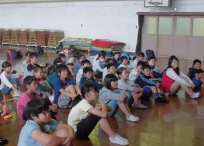 今日の6時間目,体育館に集まって,みんなの荷物点検をしました。