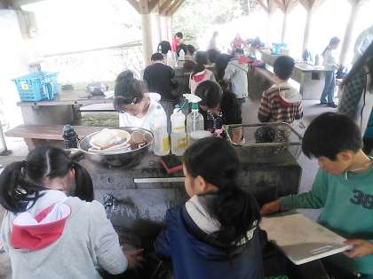 洗い残しがすこしでもあると、アウトですが、これも初めてやたった時に比べてずっと早くできました。野外炊事がとても上手になりました。どの子もしっかり協力できています。