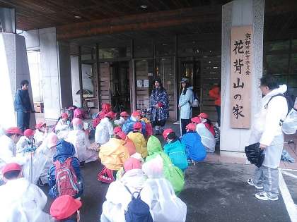 朝のつどいで、花背山の家で活動する4校の学校紹介がありました。北醍醐小学校、上賀茂小学校、西院小学校、九条塔南小学校のそれぞれの学校代表が学校の紹介をしました。その後、朝食をすませ、山登りです。残念ながら、昨夜からの雨のため、山登りはなく、峰定寺から三本杉を目指すコースに変更です。バスに乗り、峰定寺へむけて出発です。