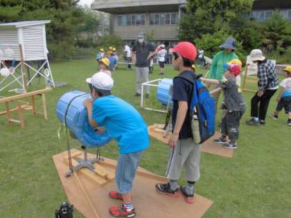 屋外学習では,準備されたたくさんの科学ゲームを楽しんだり,生き物と触れ合ったりしました。