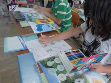 3時間目は,教務主任と一緒に理科を学んでいました。『メダカのたんじょう』という単元の学習の中で,『メダカなどの魚の食べ物となる池の中の小さな生き物』について教えてもらっていました。学習プリントを使って丁寧に学びをまとめていました。