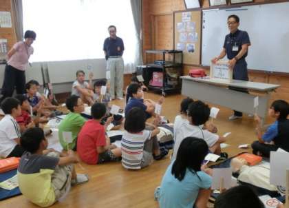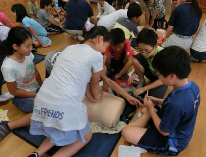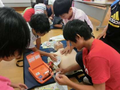 子どもたちは初めての体験に多少戸惑いながらも,教えてもらった通りに一生懸命救命のための行動について練習していました。