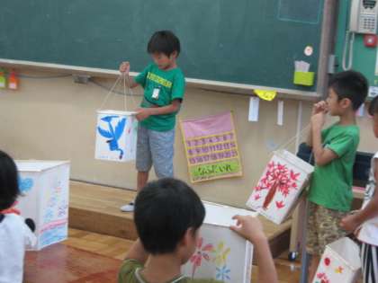 行燈の4つの面には,季節を表現したり,好きな生き物や,夏祭りの風景を表したり,それぞれの思いが込められた行燈が仕上がりました。