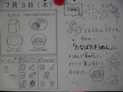 干しシイタケが苦手で、4月には泣いていた児童も、「七夕そうめんの汁も、しいたけの味がしてる。でも、干ししいたけは味がしないから大丈夫、食べられるよ」と言っていました。昆布と削り節のだしに加え、干しシイタケの戻し汁が入っていることもちゃんと見つけられましたね。