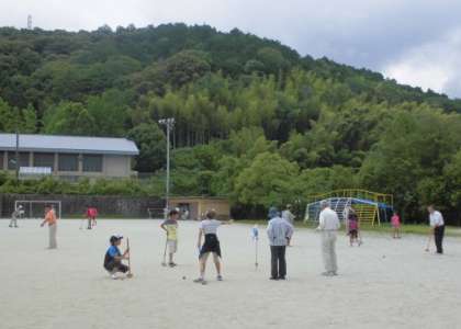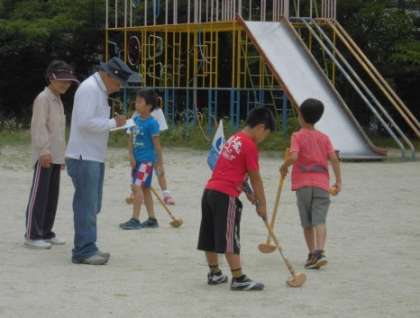 プレーをする子どもたちと,ご指導いただく体育振興会グラウンドゴルフクラブの皆様で運動場はにぎわっています。