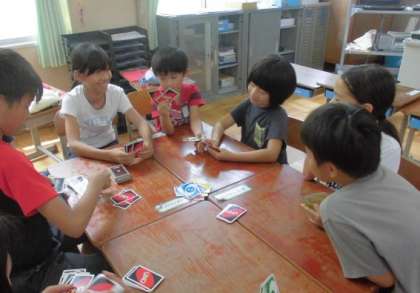カードゲームや,宝探し,椅子取りゲームをしているところです。