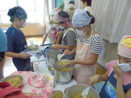 高学年が給食当番の役割を担ってくれました。全員きちんとエプロンと三角巾,マスクと身支度を整えているのが立派です。