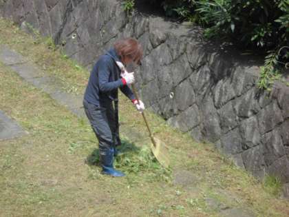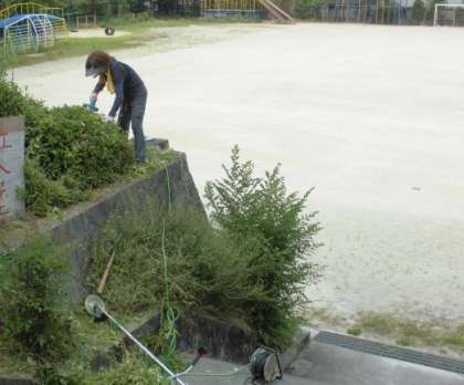 夏の日差しを受け,草木や樹木がぐんぐん背丈を増してきたので,管理用務員が,草刈り機を使って除草をしたり,低木の剪定をしてくれています。