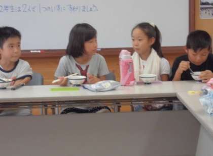 家庭科室で,5年生のお兄さん,お姉さんに調理してもらって,みんなでおいしく食べました。