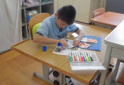 あすなろ学級2組の児童は,夏休み明けから使うノートの表紙作りをしていました。今日は,自分の名前を書いた紙を糊で上手に貼っていました。