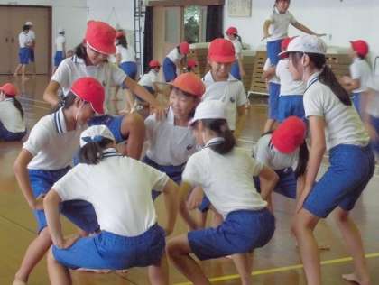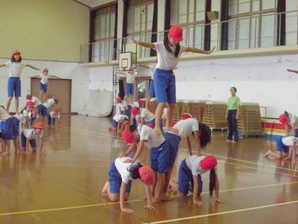 5・6年生は体育館で「組体操」の練習を進めていました。