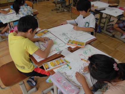 1年生は,教室で「お話の絵」を描いていました。たくさんの動物達が楽しそうな表情で描かれています。パスの使い方もカラフルで画用紙全体から子どもたちの表現する喜びが伝わってきます。