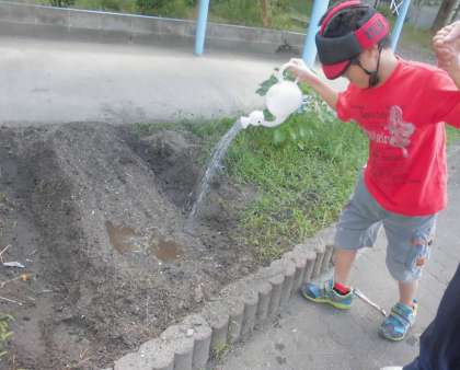 あすなろ学級2組の児童は,畑の水やりをしていました。夏の間,大切に育てていたトマトやナスやきゅうりが収穫の時期を終えたので,その後に,春菊の種まきをしたそうです。かわいい芽が出るのが楽しみですね。