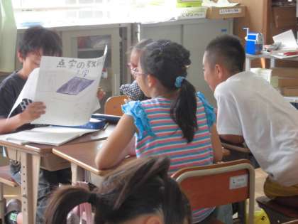 4年生もグループ学習をしていました。先日コンピュータ室で調べていたことを画用紙にまとめた成果物を手に,発表の練習をしていました。聞き手に分かりやすく伝えられるようにと工夫した発表原稿を見ながら,グループ内で練習し合っていました。聞き手の子どもたちも,友だちの発表を聞いて質問するなど,その内容の精度を高めるための協力をしていました。