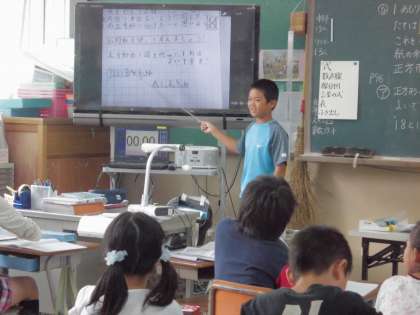 5年2組では,算数の学習をしていました。算数の学習で「公約数の考え方」を使って問題を解いていました。一人一人自力解決を図った後,自分のノートを拡大して映し出したディスプレーの前に立ち,自分の考えた道筋についてみんなの前で発表していました。