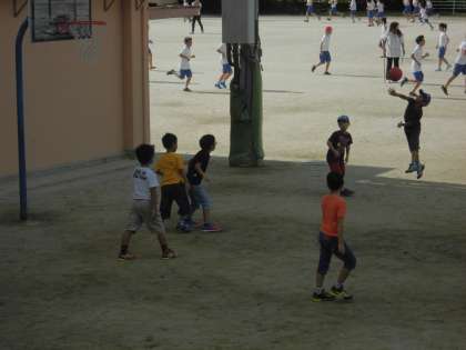 3年生以下の子どもたちは運動場周辺で遊んでいます。その中でも特に人気のコーナーがバスケットゴールがあるウサギ小屋前の広場です。