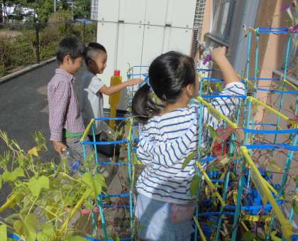 1年生は,今日も,朝顔の水やりと種とりをしています。