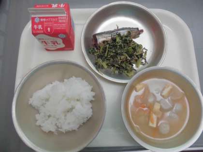 今日の給食の献立は,さんまの変わり煮・大根場の炒め物・いものこ汁・ごはん・牛乳でした。