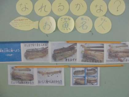 煮魚はお家で食べる機会が少ない児童が多いので,煮魚の献立の日は,上手に食べられた児童に『お魚名人』認定のカードを渡します。