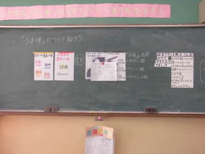先日,6年生に対しては,『朝食の大切さ』について指導をしましたが,5年生には,『うま味を知ろう』というテーマで,昨日から,給食時間の前後を活用して,日本の食文化の『出汁』について,教えてもらっています。