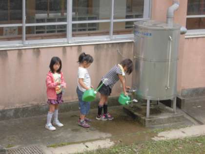 水やり用の水は,雨水タンクから汲んでいます。エコライフチャレンジです。