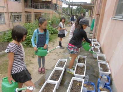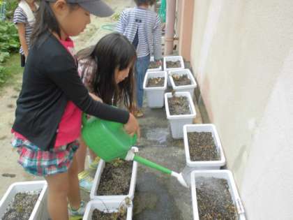 2年生は,先日野菜の種を蒔いたプランターに,やさしくお水をあげていました。