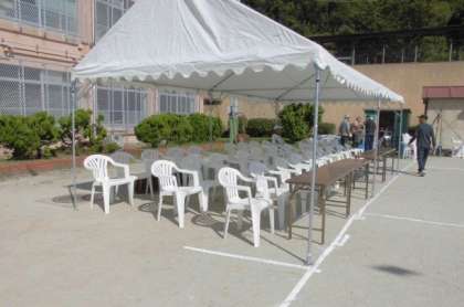 テントが張られ,いすや机を並べて,本部席,敬老席,児童席の準備が整いました。