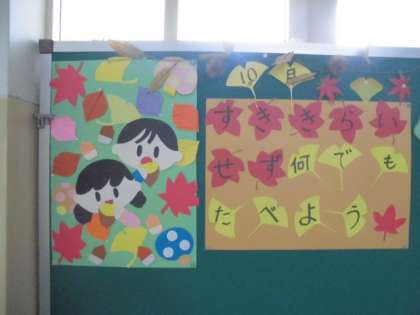 また,ランチルーム前にはススキを添えた花が飾られたり,掲示板にも10月の掲示物が貼られています。