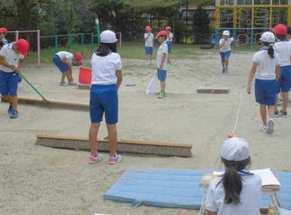 砂場をならす係,計測係,記録係,旗で合図する係など,係をローテーションしながら『走り幅跳び』の練習を進めていました。