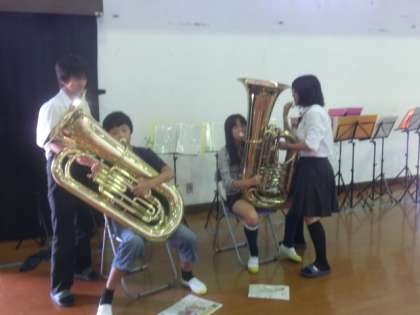 フルート,ホルン,トランペット,トロンボーン,ユーホニュウム,テューバ,ドラム(パーカッション)の7種類の楽器のコーナーに分かれ,吹奏楽部員の生徒2,3人づつに楽器の持ち方や演奏の仕方を教えていただき,児童一人ずつ楽器をさわらせていただきました。