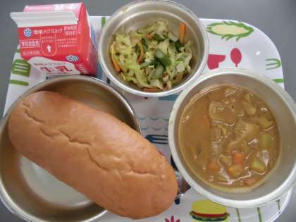 今日の献立は、麦ごはん・牛乳・チキンカレーシチュー・アスパラガスのソテーでした。