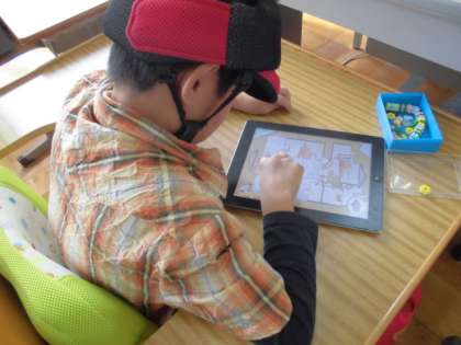 あすなろ学級2組の児童は,今日もタブレット型PCを使って,ひらがなの練習をしていました。パズルのピースが上手につながるとひらがなができ,その字がつく絵カードが現れ発音してくれるという優れもののソフトです。いつもとても熱心にPCを扱っています。