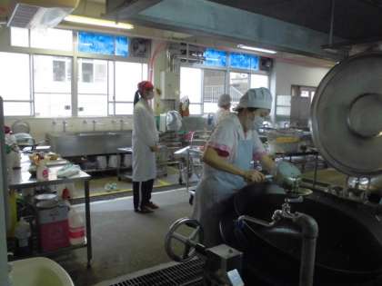 栄養教諭からの講義を聞いたり,きちんと衛生検査を受けて来ているので調理場の様子を見学したり,給食を一緒に食べたり,サービスホールで子どもたちと関わったり,自分の夢に向かって学んでいます。