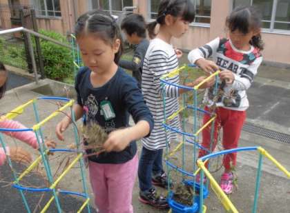 様子を見に行くと,春からずっと育てて観察してきた朝顔の鉢の前で何やら働いています。何をしているのか尋ねると,朝顔のツルで『リース』を作るそうです。支えの枠に絡みついたツルを,お友達と一緒に丁寧に外していました。協力する力も育っていますね。