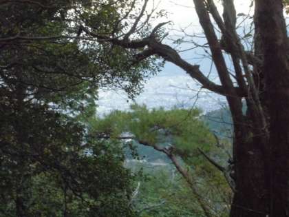 写真は,高塚山頂上485メートル三等三角点付近,木々の間から見える醍醐の町並み,美しい山の木々の様子です。