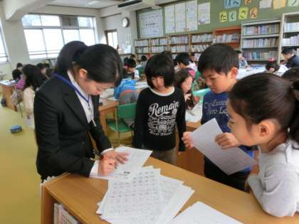 10:00から「漢字学びタイム」です。低学年は図書室で,高学年は放課後まなび教室で,各自が自学自習で学習します。漢字練習をノートにしたり,練習問題を解いたりしています。本校教員,学生ボランテイアさんは,子どもたちの質問に答え,赤ペンで丸付けをしています。