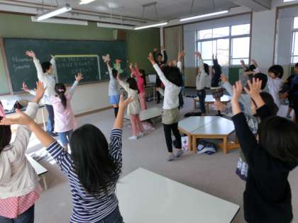 11:00からは『英語学びタイム』です。最初に低学年は多目的ルームで地域協力者の斉藤先生に英語の歌やチャンツを教えていただき,英語検定の問題にチャレンジしています。高学年は,他の教室で英語のビデオを見ます。日本語と英語のバージョンを交互に見ます。英語の発音に慣れてもらいます。30分ずつで低学年と高学年は交代します。